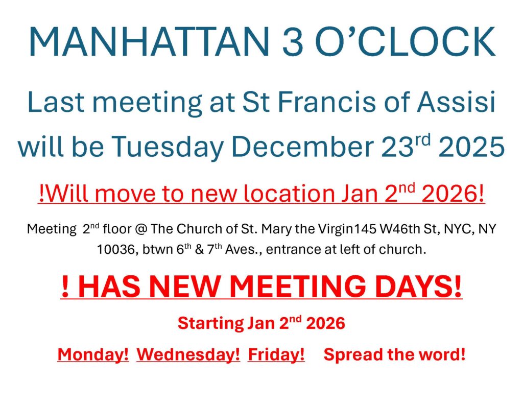 Manhattan 3 O’Clock is moving to a new location. The last meeting at St. Francis of Assissi will be Tuesday, December 23rd, 2025.