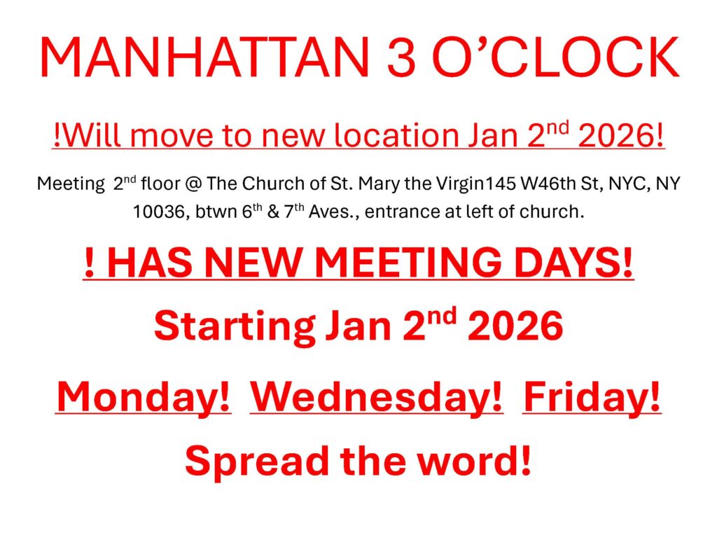 Manhattan 3 O’Clock will move to its new location on January 2, 2026. The new location is the Church of St. Mary the Virgin, 145 West 46th Street, 2nd Floor, New York, NY 10036 (between 6th and 7th Avenues). This meeting has new meeting days starting next year! These days are Monday, Wednesday, and Friday at 3pm.