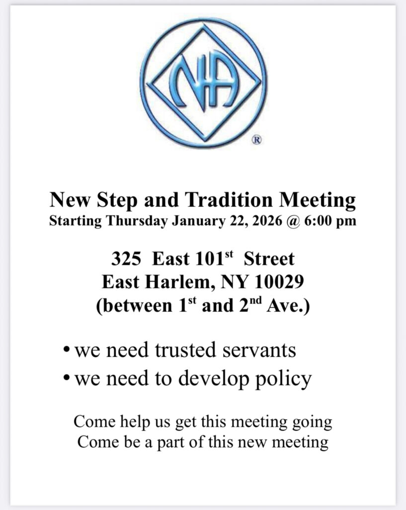 Come and be part of this new meeting! We need trusted servants and we need to create policy. The first meeting is Thursday, January 22, 2026 at 6pm at the Church of the Resurrection, 325 East 101st Street between 1st and 2nd Avenues.