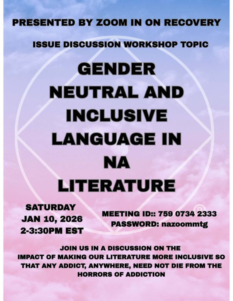 Zoom in on Recovery group is hosting an issue discussion workshop on the inclusion of gender neutral and inclusive language in NA literature.